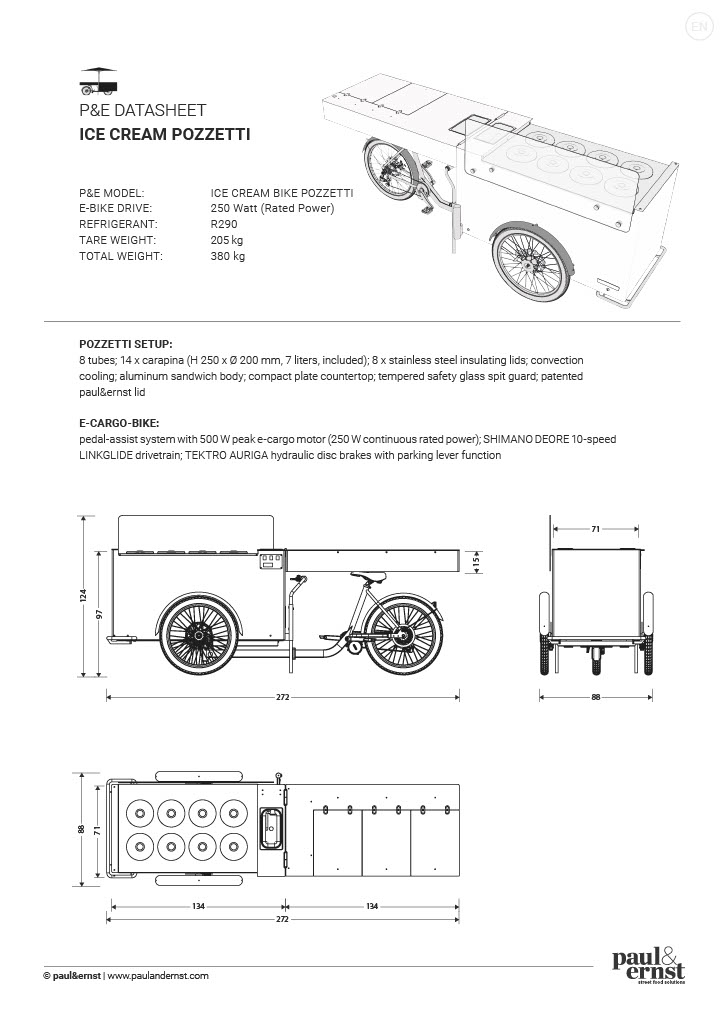 Thanks to its insulating glass lids, the Square unit ensures that the ice cream always remains visible. The Pozzetti unit impresses with its elegant presentation and offers high resistance to external influences thanks to its excellent insulation. The stylish design of an ice cream trolley or ice cream bike is guaranteed to attract attention. Whether you prefer an ice cream trolley or an ice cream bike – you can compare the paul&ernst models directly here.