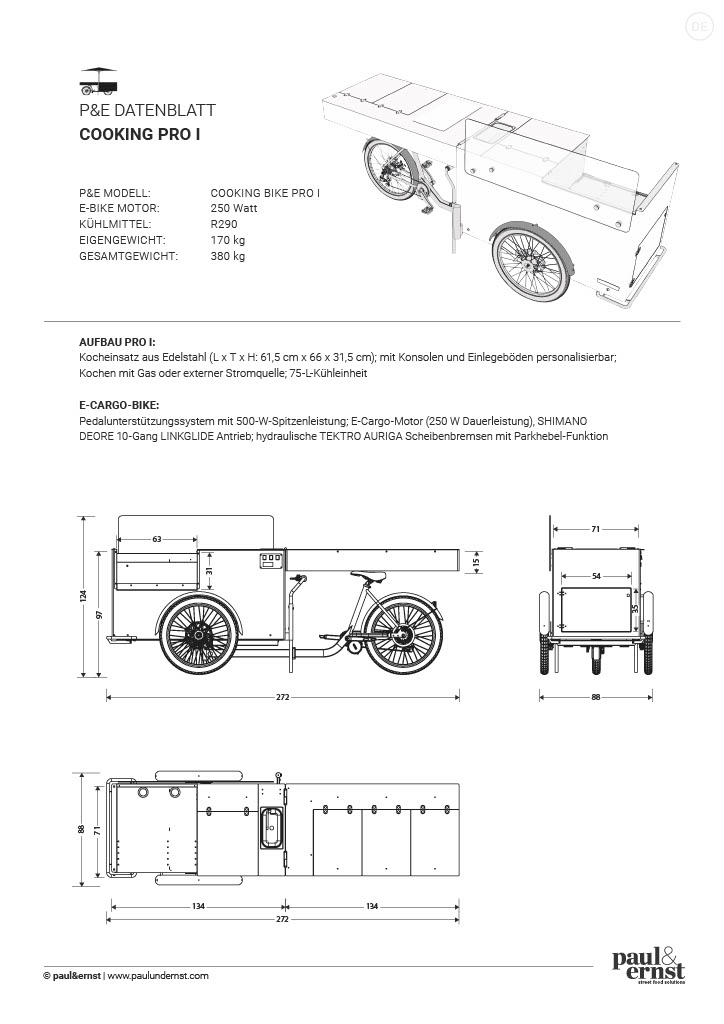 Die Paul&Ernst Streetfood Bikes können für Gas- oder Elektro- Nutzung ausgestattet werden. Wichtig: Wenn du elektrisch arbeiten möchtest, beachte bitte, dass der Fahrradakku nur 36V bzw. 24V liefert – für den Betrieb von Küchengeräten ist daher eine externe Stromzufuhr notwendig.
